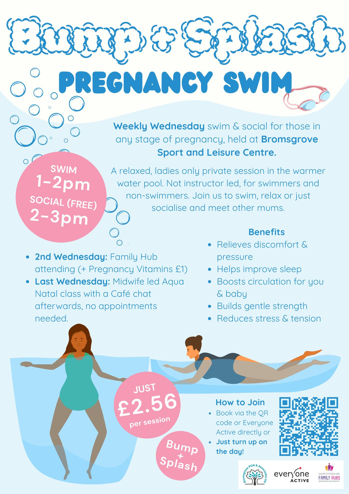 Gentle, pregnancy-safe swim, Café social with Family Hub support and advice on every 2nd Wednesday of each month. Midwife-led Q&A on the 4th Wednesday of each month.